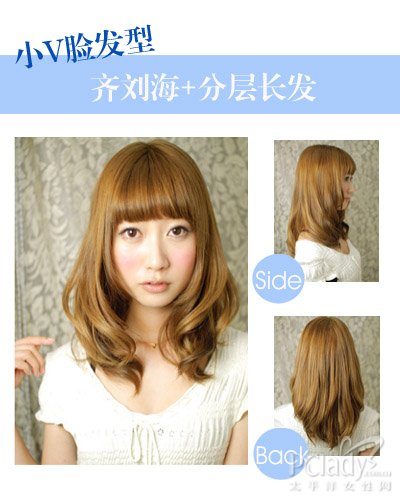 齊劉海風貌似在這個季節又卷土重來了,不管長發短發,直發卷發,MM們都喜歡搭上一個稚嫩的齊劉海,不僅掩齡,還能瘦臉。讓頭發過肩幾英寸長,下巴處分層,這款發型聰明地利用了分層的發段,先利用齊劉海遮住了額頭,臉看上去就小了一半,分層的發段將人的視覺拉到頭發上,臉自然就變小了。