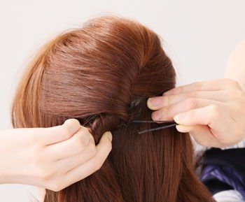 ????第二步:將頭發扭轉留意制造圓弧頭型用U型發夾固定。