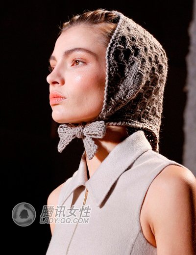 將秋冬經(jīng)典的針織鉤花元素與保暖扮靚的頭巾混合,比常見的印花絲巾更具質(zhì)感和親和力。來自Rochas秋冬秀場(chǎng)的針織頭巾x辮子發(fā)髻,勢(shì)必在本季吹起“溫暖牌”祖母手工針織頭巾風(fēng)潮。