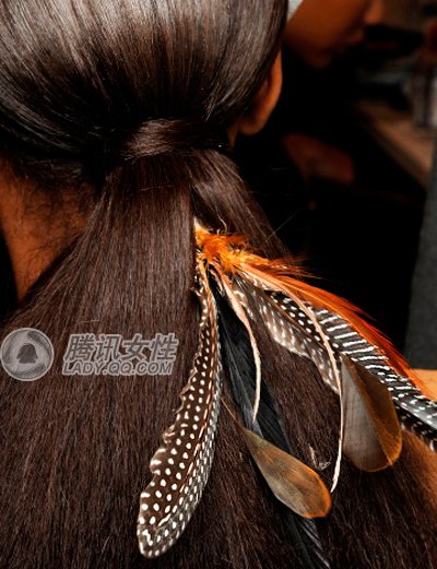 Gucci 2011秋冬秀場(chǎng)的馬尾發(fā)型獨(dú)樹一幟,用形似“毛刷”的蓬松低扎長(zhǎng)馬尾搭配長(zhǎng)長(zhǎng)的裝飾羽毛,前衛(wèi)而富有夸張的藝術(shù)效果,故意打造的干枯毛躁的馬尾造型與其精致入微的服裝形成對(duì)比,很有秋冬溫暖休閑的文藝氣系