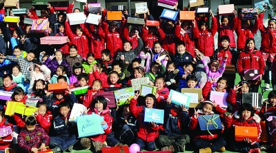 ????“鞋盒禮物”,在全世界100多個國家都舉辦過,本著互動、打破雙方隔閡的理念,倡導富裕家庭的孩子們自愿捐出自己的零用錢,和爸爸媽媽們一起為需要的孩子們準備禮物,并用鞋盒包裝起來送給困難家庭的孩子。在七橋小學的操場上,高高的一摞精心打扮過的“鞋盒禮物”堆在孩子們面前,有的還用水彩筆歪歪扭扭地寫著贈送祝語。這些都是南京市40多所中小學孩子準備的一部分。