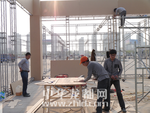 ????明日上午,由周口報業傳媒集團主辦的第13屆房車聯展將在市體育中心隆重開幕。為給前來觀展的市民提供優質的服務體驗及華麗的視覺享受,4月8日起,參展商家就已著手搭建展臺(如圖)。晚報記者 宋風 攝