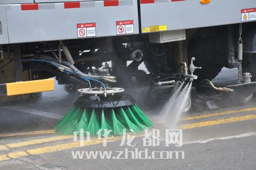 ????當天上午,記者在市政府門前看到,由宇通汽車廠家提供試機的幾臺環衛高壓清洗車和掃地車列成一排(上圖),一臺小型掃地車一邊行駛一邊清掃地面,前端幾個旋轉式毛刷(下圖)進行清掃的同時,還向地面噴灑出霧狀水,路面上的各類垃圾清掃后吸入后面的車斗里,駛過之處,路面干凈許多。隨后,大型環衛清洗車“上陣”,車體四周分頂噴、中噴和后噴,四五十米寬的道路都能輕松噴射覆蓋。經過清水“洗禮”后,兩旁慢車道上綠化帶的植被上積存的浮土被沖刷得一干二凈,綠意顯得更濃了。打開頂噴,清洗車向天空噴射出幾米高的幾股高壓水柱,有效降塵,凈化空氣。經過兩輪試驗下來,記者看到,瀝青馬路上變得干凈而清新,以往灰蒙蒙的馬路一下子變得“眉清目秀”。