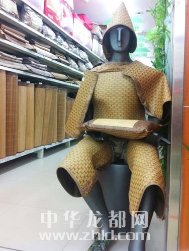 ??? 5月12日,記者在周口市區七一中路某大型超市看到,營業員把多種涼席產品裝飾在一個坐姿模特身上,在人來人往的客流中,在營業員招攬顧客的吆喝聲中,這位坐等客人上門的“蓑笠翁”不用說一句話,卻賺足了市民眼球。晚報記者 徐松 攝