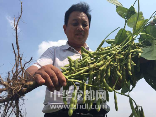 ??? 圖③ 9月25日,在西華縣逍遙鎮全國種糧大戶曹自堂的試驗基地,曹自堂看著試種的大豆新品種喜出望外。記者 張猛 攝