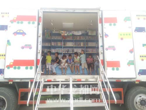 ????本報訊 8月22日,一輛帶著5000多冊兒童讀物的流動圖書車,從北京來到鄲城縣秋渠鄉希望小學。該校300多名留守兒童有的上車讀書,有的簽字借閱,都特別高興(如圖)。