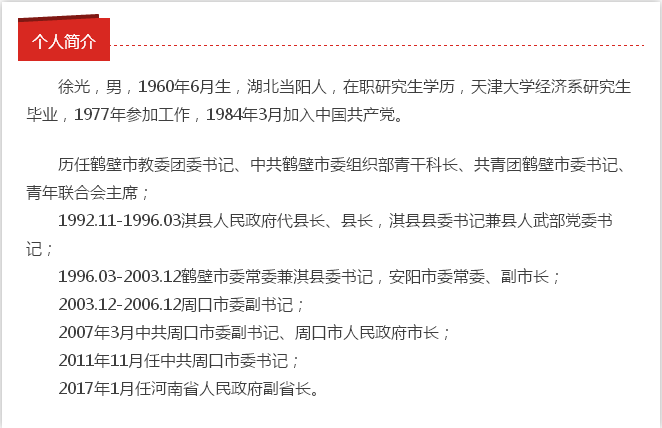 ????????1月20日上午11時,市委書記徐光在河南省十二屆人大七次會議第三次大會上當選為副省長。