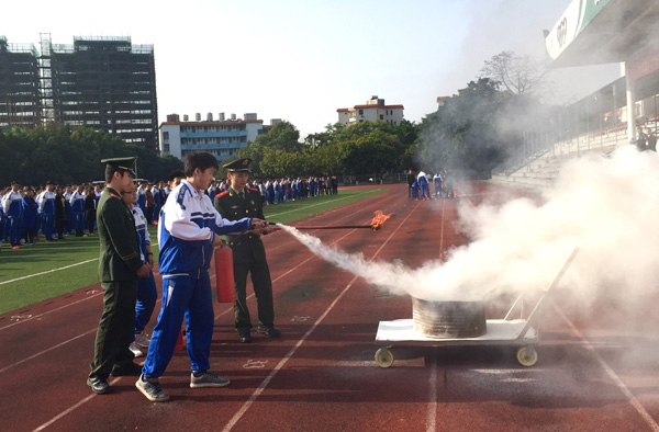 消防應(yīng)急演練結(jié)束后,消防官兵向全體師生現(xiàn)場講解如何使用滅火器,并由學(xué)生代表實際操作滅火器撲救初期火災(zāi),升旗儀式上還進行了法制安全教育。