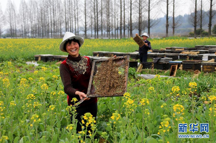 ????2月20日,安徽省黃山市萬安鎮蜂農在油菜花田里放蜂割蜜。