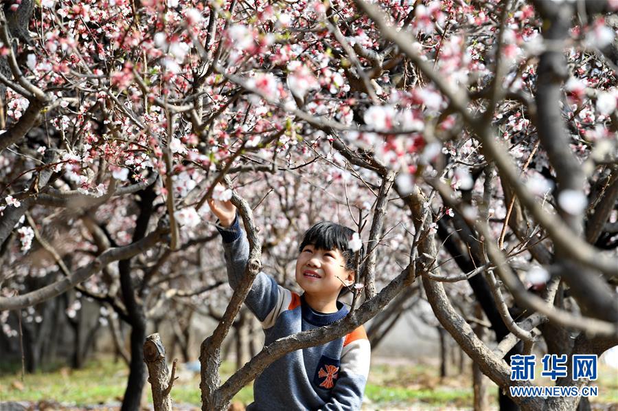 ????2月23日,一名兒童在河北省巨鹿縣巨鹿鎮東辛莊村的杏樹大棚內玩耍。近日,河北省巨鹿縣巨鹿鎮東辛莊村溫室內的杏花陸續開放,吸引游客前來觀賞。 新華社記者 牟宇 攝