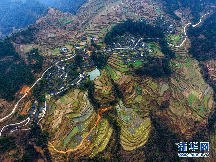 ????這是2月25日在湖南省湘西土家族苗族自治州龍山縣澤果村航拍的梯田春景。