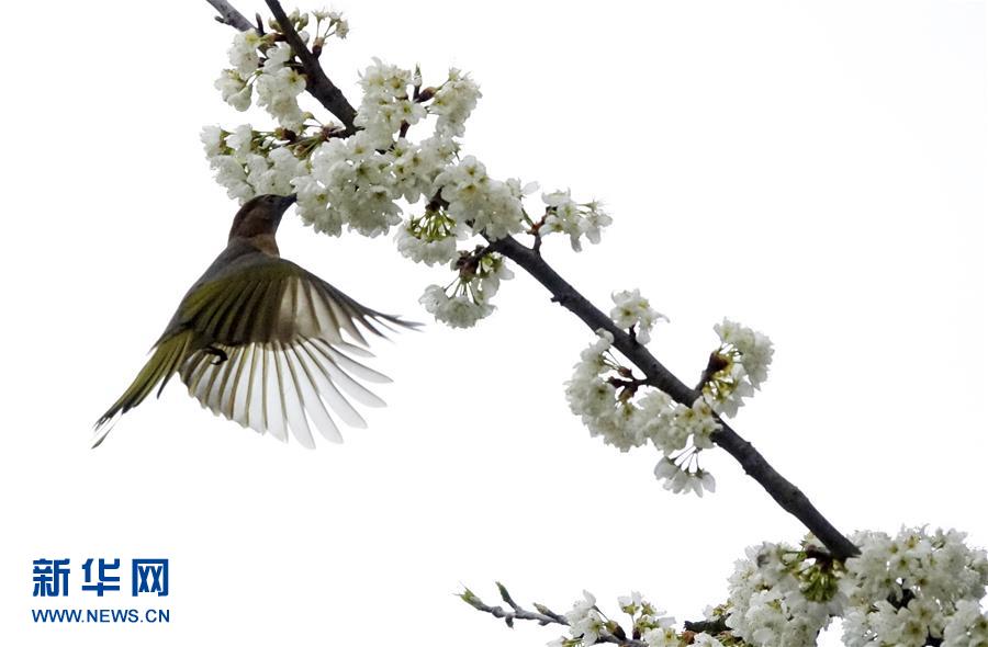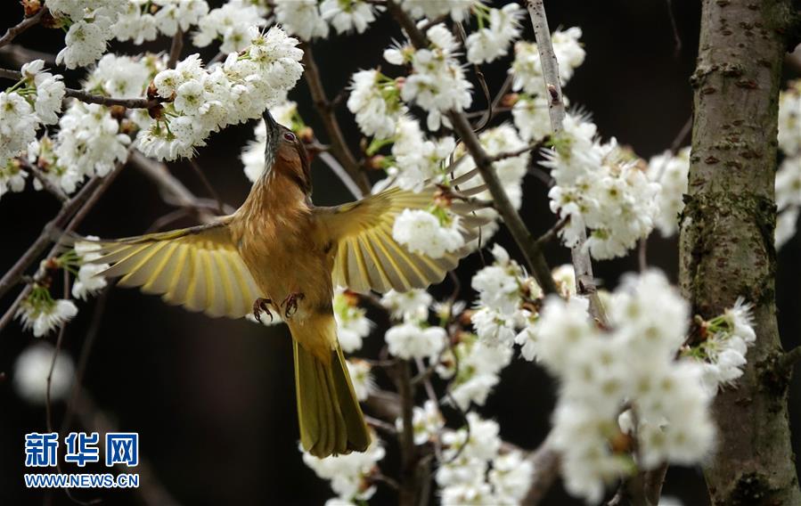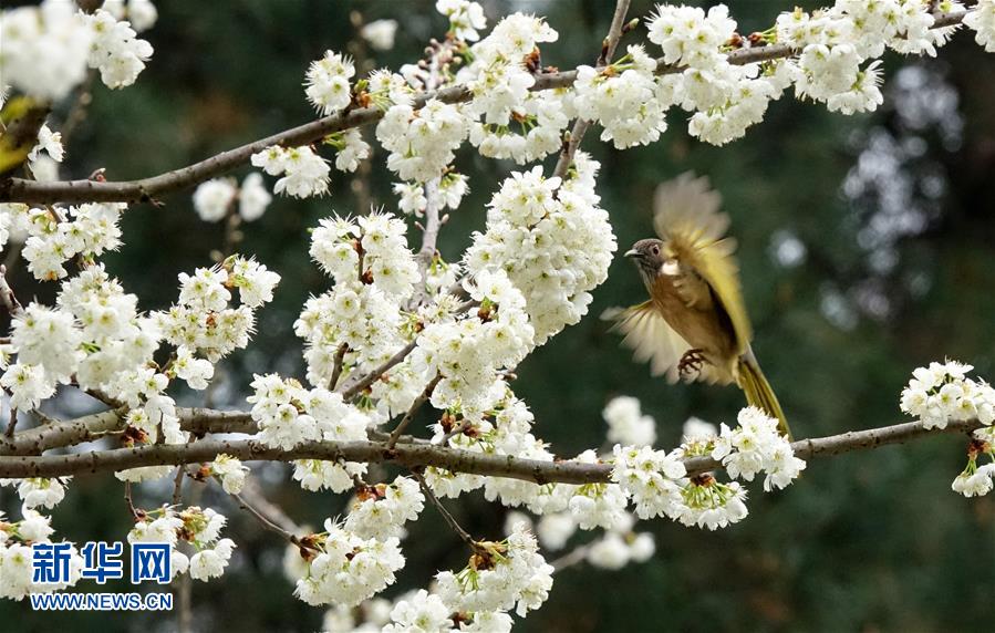 陽春三月,一只小鳥在貴陽市郊貴州植物園的花叢中覓食啄花。 新華社發(秦剛 攝)