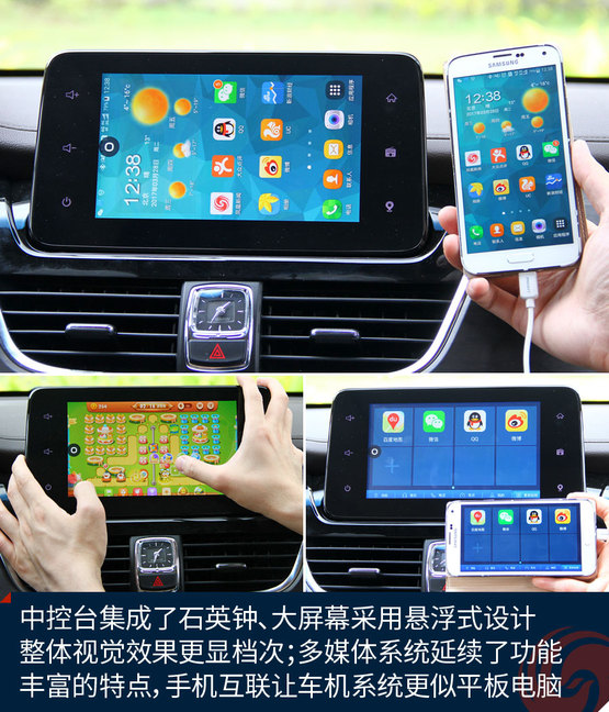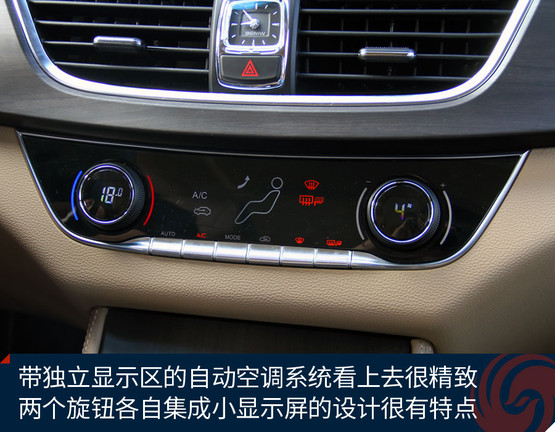 中控臺中央的大尺寸液晶屏顯示效果挺贊,高清屏、亮度高、色彩艷麗,功能上也足夠強大,收音機、藍牙免提、影音播放、GPS導航等等非常全面,前后雷達、360全景影像也能夠在這里清晰顯示,只可惜手機互聯僅支持安卓系統,希望日后能有所完善。下方的自動空調控制區很精致,也很顯檔次。