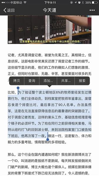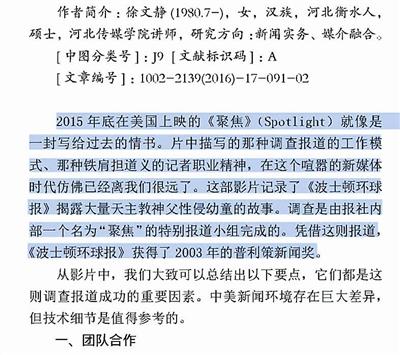 ????昨天,一名賓夕法尼亞大學(xué)的博士生在其微信公眾號上發(fā)文稱,自己2016年1月發(fā)在“新聞實驗室”的公號文章與河北傳媒學(xué)院徐文靜老師在2016年6月發(fā)表的學(xué)術(shù)論文雷同。北青報記者調(diào)查發(fā)現(xiàn),被舉報雷同的論文的22個段落中,與“新聞實驗室”的文章雷同的有18段,另有4個段落分別與新浪娛樂的一篇電影評論以及微信公眾號“今天道”的一篇文章的相應(yīng)章節(jié)雷同。昨天下午,河北傳媒學(xué)院宣傳部的工作人員告訴北青報記者,學(xué)校相關(guān)領(lǐng)導(dǎo)已經(jīng)找徐文靜進行了談話,并第一時間展開調(diào)查,最終會查實情況做出處理意見。 ???? ????微信公號《今天道》原文 ????傳媒老師論文被指照抄 ????昨天上午,微信公眾號“新聞實驗室”發(fā)布了一篇公告,公告的作者是一名賓夕法尼亞大學(xué)的博士生,他表示自己近日發(fā)現(xiàn),河北傳媒學(xué)院一名叫徐文靜的老師于學(xué)術(shù)刊物《青年文學(xué)家》2016年第17期上發(fā)布了一篇標(biāo)題為《從電影<聚焦>看記者的采訪技巧》的文章,內(nèi)容與他2016年1月發(fā)布的《獲普利策獎的調(diào)查報道是怎么做的?這部電影就是一本教科書》的文字多處雷同。“幾乎是我此前發(fā)布的文章的翻版,只是刪除了少許段落而已。” ????《青年文學(xué)家》雜志的版權(quán)信息顯示,該雜志為旬刊,2016年第17期在當(dāng)年6月份出版。北青報記者獲取了涉事論文,徐文靜是這篇論文的唯一署名作者。作者簡介中介紹,生于1980年的徐文靜為河北衡水人,碩士,目前是河北傳媒學(xué)院講師,研究方向為新聞實務(wù)和媒介融合。 ????北青報記者比較了徐文靜的《從電影<聚焦>看記者的采訪技巧》和“新聞實驗室”的《獲普利策獎的調(diào)查報道是怎么做的?這部電影就是一本教科書》,發(fā)現(xiàn)兩篇文章確有大量雷同。 ????“新聞實驗室”原文共有“團隊合作”、“完善的資料庫”、“不停地采訪,不停地看資料”、“線人”、“采訪技巧”、“利用法律”、“旁觀者視角”、“報社的投入”8個小標(biāo)題。而徐文靜文章的小標(biāo)題依次為“團隊合作”、“完善的資料庫”、“線人的重要性”、“采訪技巧”、“報社的投入”,共5個小標(biāo)題。 ????小標(biāo)題下的內(nèi)容也高度雷同,除去小標(biāo)題,徐文靜的論文全文共有22個自然段,其中18個自然段與“新聞實驗室”雷同。絕大多數(shù)段落文字完全一致,區(qū)別之處主要是一些字詞、標(biāo)點的調(diào)整,如“新聞實驗室”原文中寫道:“記者也不是孤膽英雄——他/她的背后還有編輯。”徐文靜論文中相應(yīng)的話是:“記者也不是孤膽英雄,他的背后還有編輯。” ??? ????被指抄襲的論文 ????涉事論文由三篇文章“構(gòu)成” ????北青報記者調(diào)查發(fā)現(xiàn),徐文靜論文的22個自然段中,除了18個自然段和“新聞實驗室”2016年1月發(fā)布的文章雷同外,另外4個自然段,也可以在網(wǎng)上找到出處。 ????在小標(biāo)題“采訪技巧”下的內(nèi)容中,論文用3個自然段講述了影片中兩名演員的一段“交叉采訪戲”,這段內(nèi)容出現(xiàn)在新浪娛樂2015年9月發(fā)布的一篇影評文章中。 ????2015年9月,電影《聚焦》在威尼斯電影節(jié)舉行首映式,第二天一名新浪娛樂深度策劃編輯發(fā)表了一篇題為《<聚焦>:一曲唱給傳統(tǒng)媒體記者的贊歌》,文中記述了影片中的那段“交叉采訪戲”。北青報記者對比發(fā)現(xiàn),徐文靜論文中的3個自然段與《<聚焦>:一曲唱給傳統(tǒng)媒體記者的贊歌》中的相應(yīng)段落幾乎一字不差。 ????昨天下午,《<聚焦>:一曲唱給傳統(tǒng)媒體記者的贊歌》的作者在接受北青報記者采訪時表示,該文章是其為電影《聚焦》首映式撰寫的影評,首映式第二天便在新浪娛樂網(wǎng)站上發(fā)布。作者對北青報記者表示:“文章是我獨立撰寫的,我并不認識徐文靜這個人,她沒有參與到這篇文章的寫作,我們也沒有給她任何授權(quán)。” ???? ????微信公號《新聞實驗室》原文