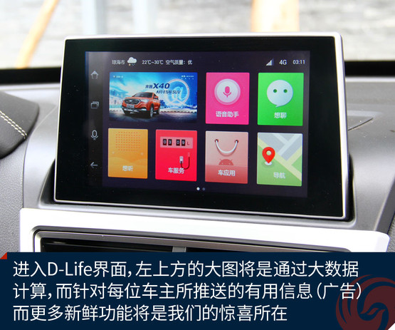 不過跟奔騰X40接觸兩天之后,會發現它大可不必在對手林立的市場中血拼顏值,靠實力不俗的獨門絕技一樣能夠輕松獲得一席之地。既然面向年輕用戶,豐富的車載娛樂系統很關鍵。大屏幕、手機互聯等等似乎已經是這類車的標配。奔騰X40更進一步,所搭載的D-Life系統讓我們看到了它引領潮流的勁頭。
