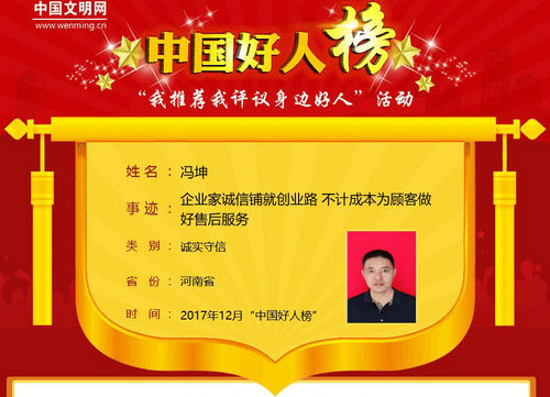 中華龍都網訊(周口報業全媒體記者 馬治衛)1月10日下午2:00,由中央文明辦主辦的2017年12月中國好人榜發布儀式暨全國道德模范與身邊好人現場交流活動在惠州廣播電視傳媒集團舉行。太康縣馮坤成功入選2017年12月份“中國好人榜”。截至目前,太康縣“中國好人”數量已達27位,據全國縣級前列。