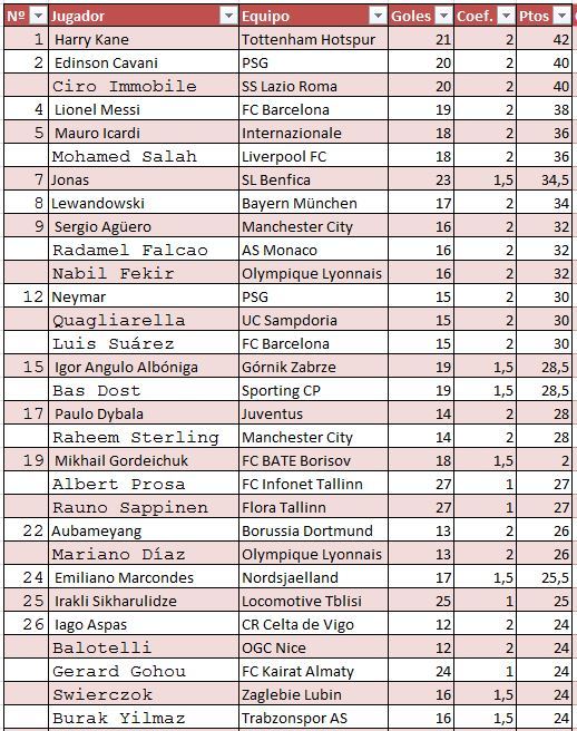 目前為止,凱恩已經(jīng)打進21粒聯(lián)賽進球,超過卡瓦尼、因莫比萊,高居歐洲金靴獎的第一名。梅西以19粒進球位居第4。蘇亞雷斯近期狀態(tài)回暖,連續(xù)取得進球,目前也收獲了15粒進球,并列內(nèi)馬爾,位居第12名。