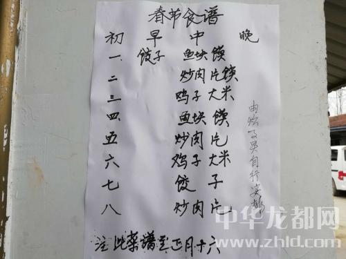 午飯時(shí),老人們井然有序地端著饅頭、大米粥、小酥肉等在餐廳內(nèi)就餐。兩個(gè)剛吃過飯的老人仔細(xì)查看貼在食堂門口的《春節(jié)食譜》,路過的一位老太太開玩笑說他們吃著碗里看著鍋里。李學(xué)告訴記者:“從正月初一到正月十五,敬老院的菜譜葷素搭配,每日三餐不重樣。5名炊事員一門心思想讓老人吃得香、吃得鮮、吃得好。”同時(shí),記者發(fā)現(xiàn)在敬老院的前排房間前,兩名服務(wù)員正推著餐車一間挨著一間為行動(dòng)不便的老人們送水、送飯。