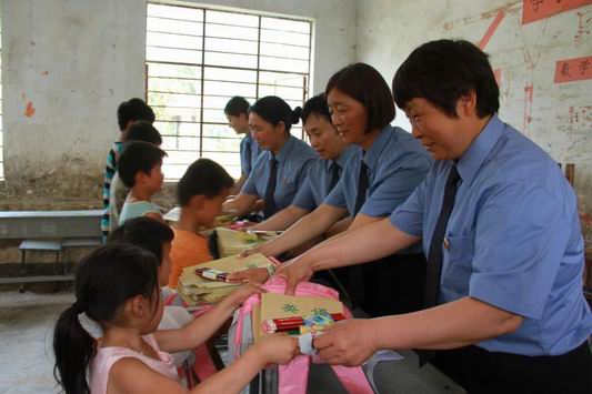 該院2013年成立了“檢察官媽媽”愛心服務隊,與貧困家庭結成對子,一對一的幫扶,為貧困的留守兒童解決生活、學習上的實際困難。每年的“六 一”兒童節、中秋節、春節期間慰問貧困兒童,給他們帶去學習用具、衣物為他們表演自編自演的節目。女檢察官們用女性特有的細心、耐心和愛心,不但在物質上給予幫助,在心靈上給予關懷,讓他們在陽光下健康快樂的成長。