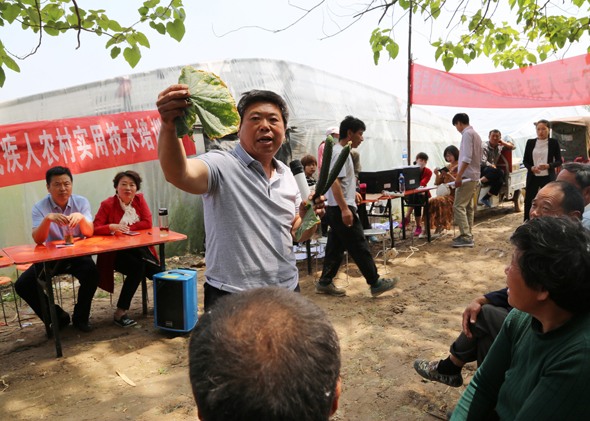 5月10日,在鹿邑縣馬鋪鎮完樓村殘疾人士付天軍的培訓基地——蔬菜種植合作社助殘大棚內,來自鹿邑縣馬鋪鎮、渦北鎮產業集聚區的150多名建檔立卡貧困殘疾人,齊聚這里免費學習黃瓜種植技術,付天軍在大棚內手把手地進行指導,來自華陽學校的農業專家李中蘭也應邀在大棚內對常見的病蟲害進行詳細講解。