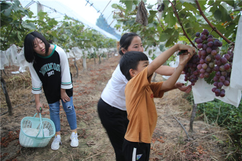 近日,商水縣鄧城鎮天力生態葡萄園的葡萄大面積成熟,因種類多、口感好,前去采摘的市民絡繹不絕。圖為9月1日幾名市民在園內采摘葡萄。