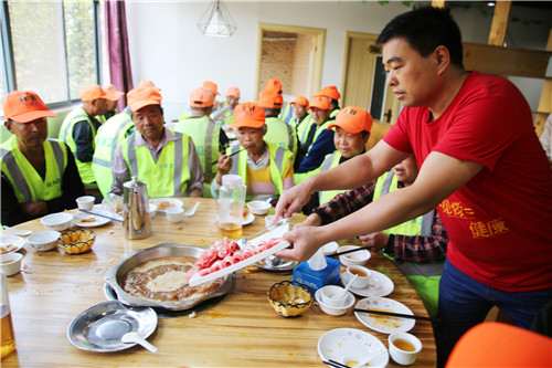 姜玉伸是承擔鳴鹿路北段保潔任務的一名老環衛人,他告訴記者:“從今天夏天開始,該店就在店里設置了環衛工人免費休息飲水點,有時候工作量大的時候,中午回不了家,店老板就讓我們在飯店免費就餐。今天,該店又準備了免費火鍋,讓我們提前過重陽節,我們感覺心里暖暖的。”