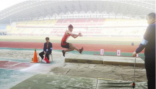 10月24日上午,河南省第七屆殘疾人運動會跳遠比賽在市體育中心體育場進行。在跳遠賽場,參賽選手完成每一次跳躍后,都會與裁判員進行溝通,認真對待比賽。 ②8 記者 牛思光 攝