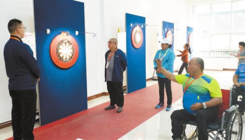 10月24日下午,河南省第七屆殘疾人運動會飛鏢項目坐姿組比賽在市體育中心老年館進行。參賽選手在認真比賽的同時,也會在比賽間隙放松心情,相互分享各自的心得,享受比賽的過程。②8 記者 牛思光 攝