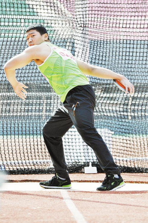 10月24日上午,河南省第七屆殘疾人運動會田徑項目中的擲鐵餅比賽正進行得如火如荼。圓圓的鐵餅從運動員的手中拋出,劃過美麗的天空,落在草地上。該項運動展示了運動員陽剛、拼搏的一面。圖為比賽現場。②8 記者 梁照曾 攝