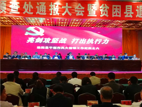 10月31日上午,淮陽縣干部作風大整頓查處通報大會暨貧困退出縣級自評動員會在羲皇賓館東三樓會議廳召開。縣委書記馬明超出席會議并講話,縣長王毅主持會議,縣委副書記、政法委書記岳新坦宣讀《脫貧攻堅督查通報》,縣委常委、縣紀委書記、縣監委主任王之夢宣讀《通報》,被通報單位負責人作表態發言。