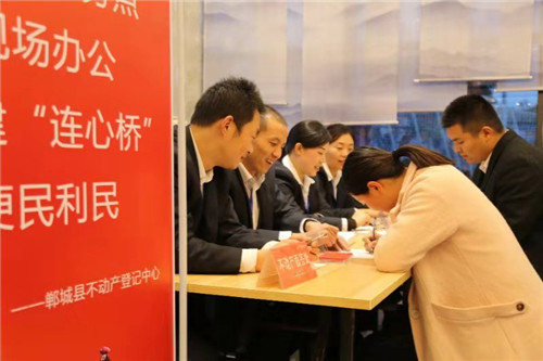 11月10日至13日,鄲城縣不動產登記中心緊緊圍繞“服務群眾、服務民生”,用釘釘子的精神,苦練繡花功夫,創新服務方式,主動貼近服務,擦亮“小窗口”,進駐剛開盤的樓盤,積極搭建起便民利民“連心橋”,真正做到讓信息多跑路、讓群眾少跑路,實現了“流程順暢、高效便捷、群眾滿意”的業務辦理,受到了辦事群眾和企業的高度稱贊。