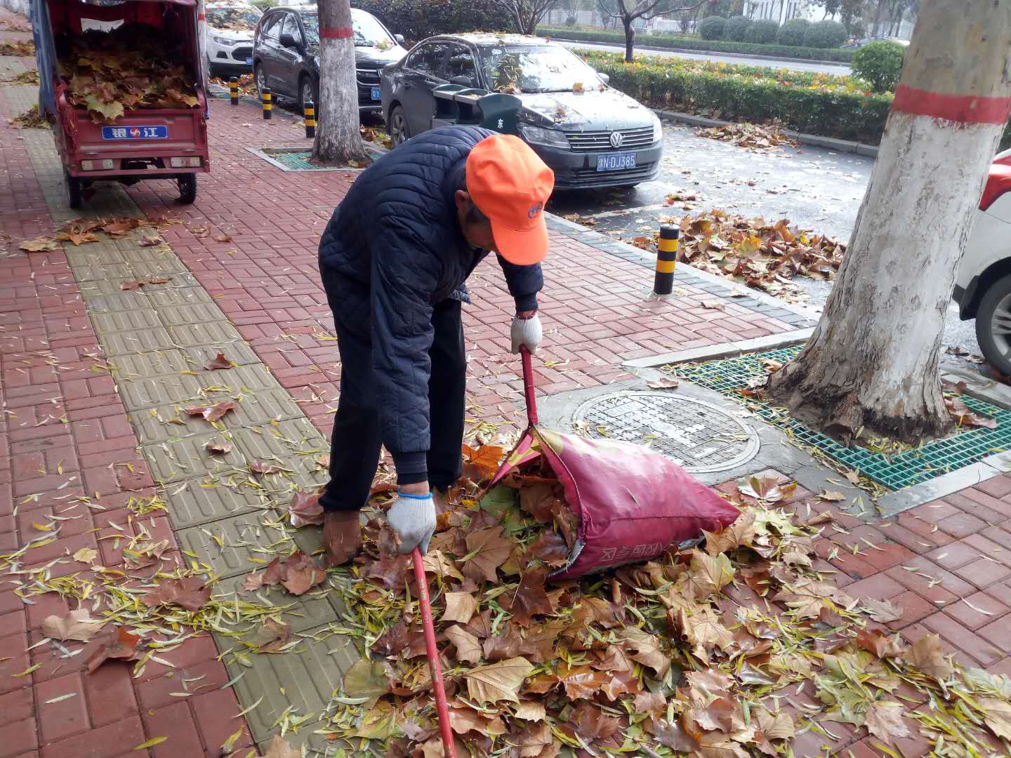 12月3日晚上,周口市中心城區風急雨驟,樹葉落了一地。4日上午天放晴,環衛工人紛紛上街清掃落葉。負責興旺路的環衛工人告訴記者,他以前兩個小時就能打掃完,而當天他干了3個小時還沒有干完,估計還得再干1個多小時。圖為環衛工人在清掃落葉。