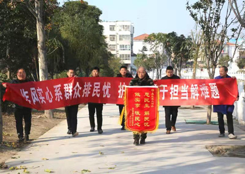 12月9日,來自鹿邑徐小橋社區的居民將一面繡有“思民生 解民憂 做實事 暖民心”的錦旗和"作風實心系群眾排民憂 ,護五河勇于擔當解難題"條幅送到鹿邑縣五河辦王力主任手中,感謝他們破解困擾居民多年的“內澇”難題。