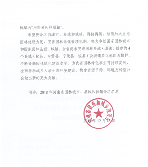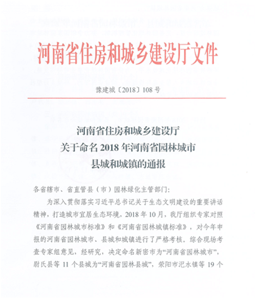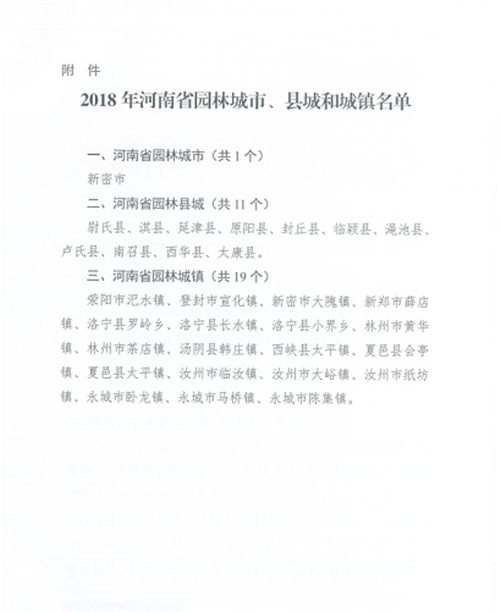 其中,新密市1地被命名為河南省園林城市,太康縣、西華縣、尉氏、淇縣、延津縣、原陽縣等11個縣被命名為河南省園林城市,登封市宜化鎮、新密市大隗鎮、新鄭市薛店鎮等19個鄉鎮被評為河南省園林城鎮。