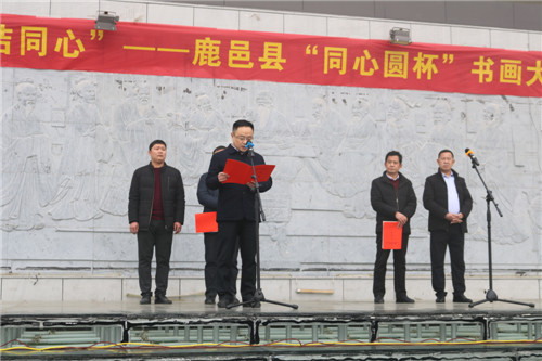 為慶祝改革開放40周年,深入學習習近平新時代中國特色社會主義思想和黨的十九大精神, 鞏固和發展愛國統一戰線,在新時代畫好最大同心圓, 團結和帶領各族各界人士深入挖掘中華優秀傳統文化蘊含的思想觀念、人文精神、道德規范,讓中華文化展現出永久的魅力和時代風采, 12月20日上午,由中共鹿邑縣委統戰部主辦、縣文學藝術界聯合會承辦、“天地人筆業”協辦的鹿邑縣“紀念改革開放四十周年·同心圓杯書畫大賽” 在城區問道苑廣場開展。縣委常委、統戰部部長閆家明出席開幕式并講話。縣委統戰部常務副部長李繼良,縣文聯主席王亞飛,副主席于連河以及本次全體獲獎和入展作者,文聯所屬各協會主席團成員近200人參加開幕式。