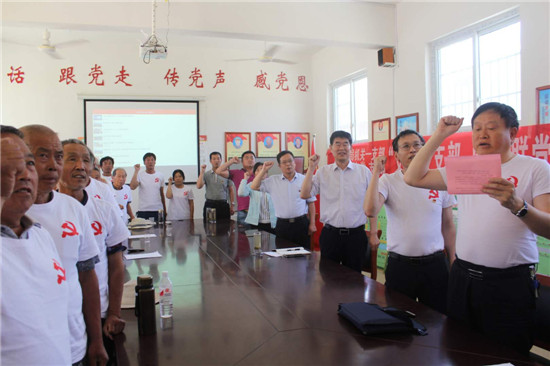 縣教體局黨組書記、局長劉現營,城郊鄉鄉長王忠,縣教體局機關一支部書記、主任科員張本寶,城郊鄉副鄉長晉惠萍等帶領與會黨員舉起右拳,挺起胸膛,莊嚴宣誓,重溫了入黨誓詞。