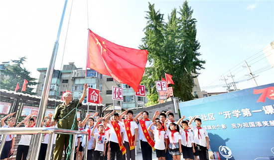 伴著雄壯的國歌聲,30多名孩子目不轉睛地看著國旗冉冉升起……為迎接新中國成立70周年,近日,江蘇省揚州市邗江區雙橋街道文苑社區在社區國旗臺廣場,組織開展了開學第一課“我與國旗合個影、我為祖國添笑臉”活動。鮮艷的五星紅旗、燦爛的孩子笑臉,組成了一幅和諧美麗的畫面。