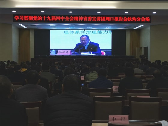 根據省委統一部署,11月27日,學習貫徹黨的十九屆四中全會精神省委宣講團報告會在周口市舉行,扶溝縣四個班子領導和縣直各單位負責人在扶溝分會場聆聽宣講報告。