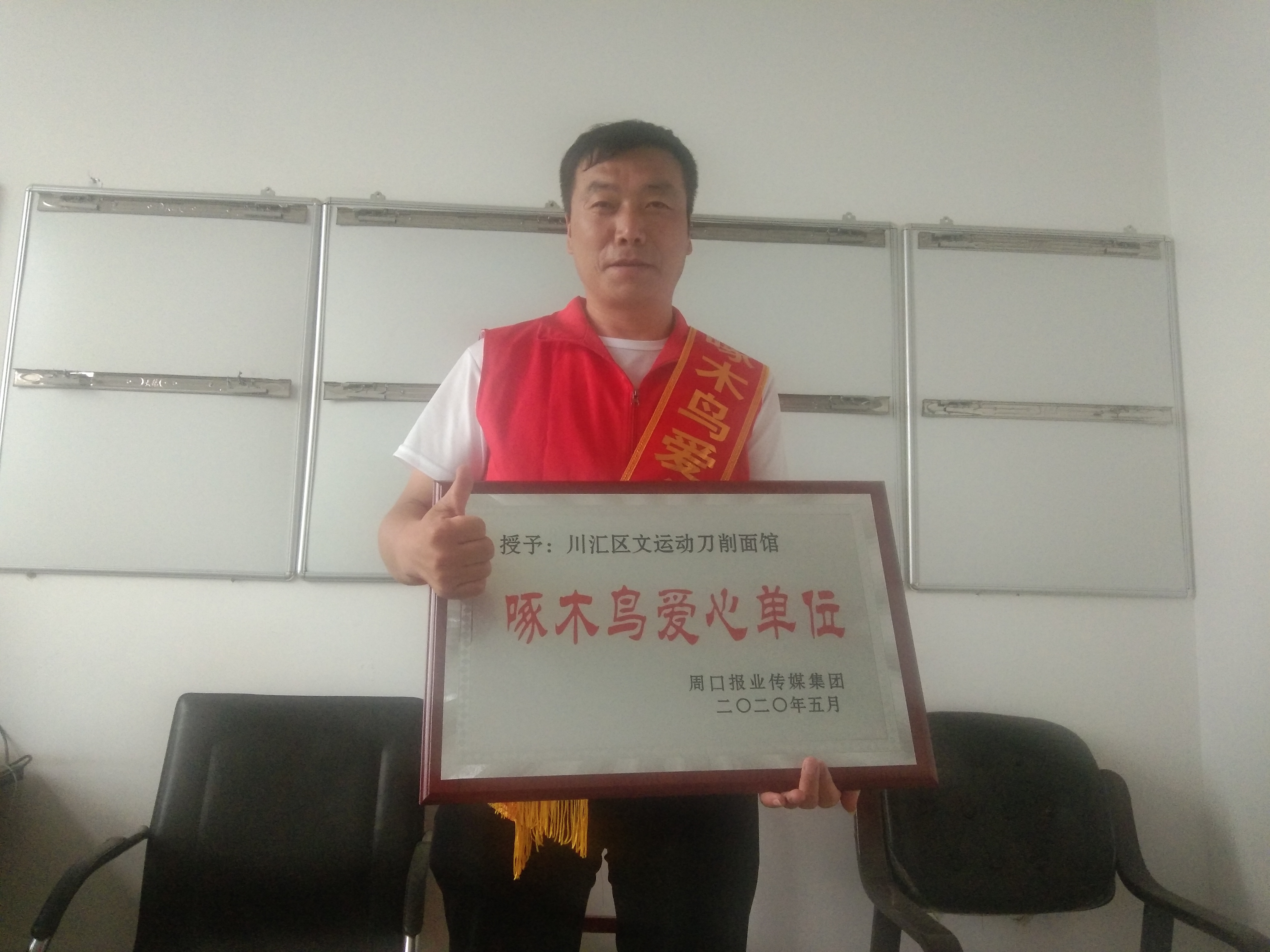 6月15日下午,周口報業傳媒集團14樓會議室內,熱鬧非凡,10名優秀啄木鳥志愿者和10家啄木鳥愛心單位被隆重表彰,他們一個個身披綬帶,上臺領獎,臉龐洋溢著自信而美麗的笑容。而文運動經營的“川匯區文運動刀削面館”被評為啄木鳥愛心單位,這無疑是對他多年來堅持參加公益事業的褒獎。