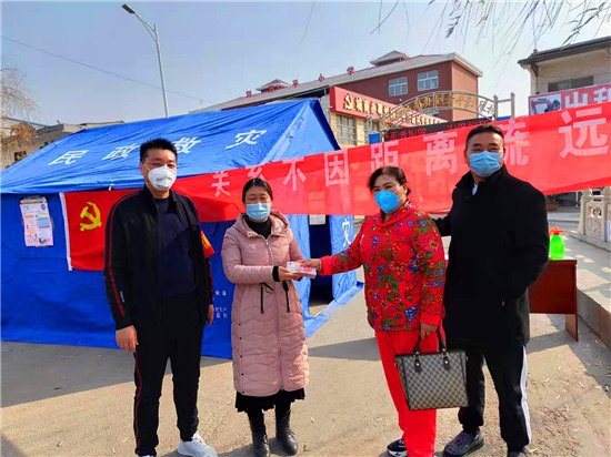 防疫物資緊缺是開展防疫工作面臨的共同難題。王七峰在防疫工作開始后,第一時間向城南辦事處捐助資金5萬元,并發動親屬積極捐款,其三哥王永紅捐助資金2萬元支持城南辦事處疫情防控工作,14歲的侄子王璽博也將自己的5000元壓歲錢捐了出來,為抗擊疫情助力。之后,王七峰除了統籌村里的防疫工作外,每天早上6點,還會準時到村里各個防控點或巡查或值守,始終堅守在排查登記、區域防控第一線。有了王七峰的帶頭表率,該村的干部、黨員、志愿者紛紛加入抗疫隊伍中來,村民們也是有錢出錢、有力出力,大家眾志成城,有效落實了聯防聯控、群防群治的各項措施。