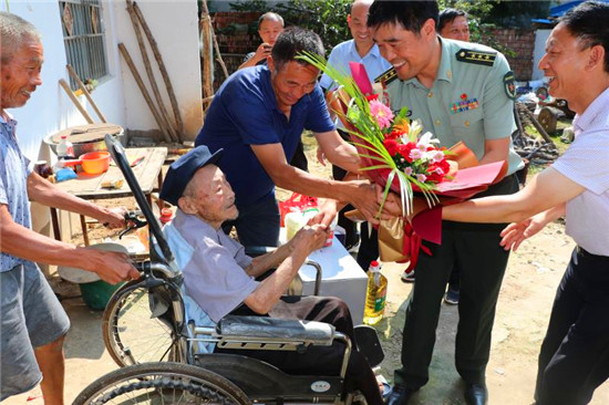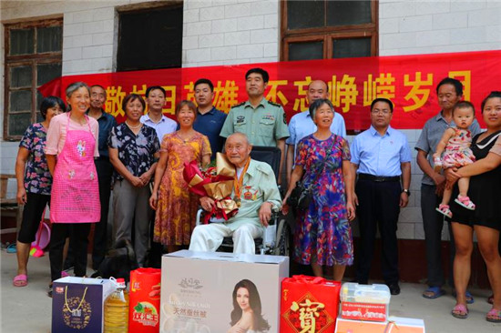 于永前一行來到楊廟鄉大祁行政村時已近中午,正趕上97歲抗日老戰士吳之太過生日。吳之太老少一家人歡聚一堂,其樂融融。看到慰問組的到來,老人喜極而泣。吳之太老人擦著眼淚說:這些年沒少給黨和政府找麻煩,尤其是縣退役軍人事務局成立后,幫助他解決了好多困難和問題,并定期來看望他,今天又見到大家,真不知道該說什么好。潘布道代表退役軍人事務局向老人祝賀生日并告訴老人說:抗戰老戰士是民族的英雄、國家的財富,為黨的革命和建設作出了不可磨滅的貢獻。今后,將一如既往地關心和幫助抗戰老戰士,盡力幫助解決生活中的實際問題,在全社會形成尊重抗戰老戰士、尊崇抗戰老戰士、關愛抗戰老戰士的良好氛圍。