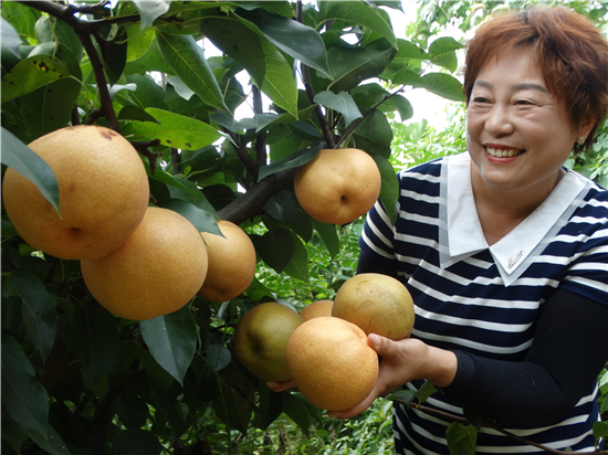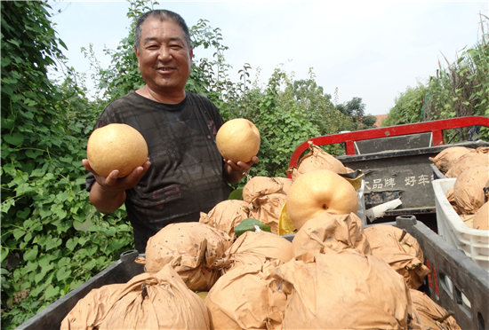 走進一排排枝繁葉茂的梨園基地,葉子在陽光的映襯下泛著綠油油的光亮,套著袋的黃金梨掛滿了枝頭。“恁瞧瞧這金黃色的梨果,長的多喜人,最大的梨果估摸著有三斤多重,最小的也有斤把重,皮薄肉厚汁多,既香甜可口,又無核無渣,很是俏銷。”采摘期間,果農們歡聲笑語,興致勃勃地說。