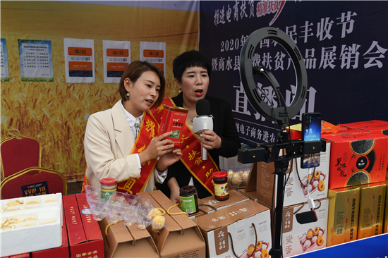 9月22日,兩名“網紅”在商水縣中國農民豐收節暨商水縣消費扶貧產品展銷會上進行直播銷售。近年來,商水縣大力發展電商扶貧,出臺政策,幫助農民通過網絡直播等手段把本地的豬蹄、咸鴨蛋、牛肉、變蛋、黑色五谷等特色農產品銷往全國各地,打開農產品銷售新渠道,為農民脫貧致富奔小康增添新動能。