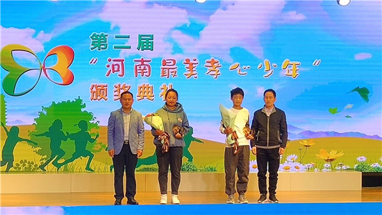 10月20日,河南省第二屆“河南最美孝心少年”頒獎典禮在河南省實驗學校鄭東小學舉行,全省表彰10名“河南最美孝心少年”,分別頒發獎杯、證書和1萬元獎勵。省教育廳副廳長毛杰等領導為孝心少年頒獎并合影留念。鄲城縣汲水二中學生薛勝楠光榮受獎。