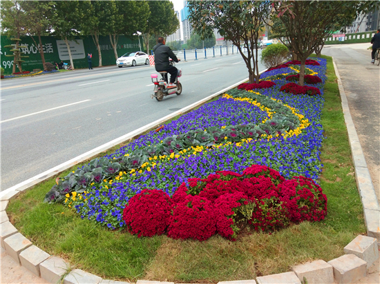 紅色、黃色、紫色的花兒,還有造型別致的景觀樹……10月21日,記者在周口中心城區七一東路上的一處綠化帶內看到了這樣一組造型別致的景觀造型,扮靚了綠化帶,給人耳目一新的感覺。記者 張洪濤 攝