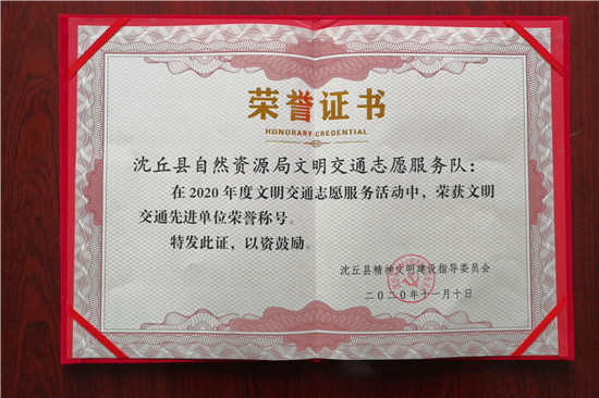 為大力弘揚“奉獻、友愛、互動、進步”的志愿服務精神,樹立典型、激勵先進,近日,沈丘縣精神文明建設指導委員會對2020年度文明交通志愿服務活動情況進行通報表彰,全縣25家部門單位文明交通志愿服務隊、101名文明交通優秀志愿者受表彰,沈丘縣自然資源局名列其中。