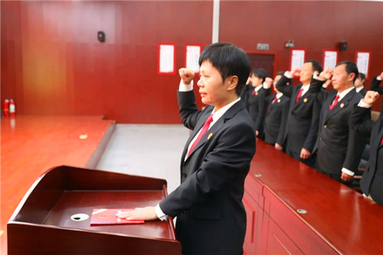 宣誓儀式開始,全體起立,奏唱《中華人民共和國國歌》。隨后,領誓人張冬梅左手撫按《中華人民共和國憲法》,右手舉拳,誦讀誓詞。其他宣誓人列隊肅立,舉起右拳,莊嚴跟誦。
