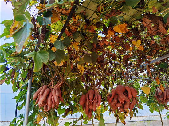 西華縣農科所積極開展“空中結薯”試驗種植研究,并取得成功。“空中結薯”采取嫁接技術,選用旋花科植物牽牛作砧木,脫毒薯苗作接穗嫁接而成,嫁接成活后栽到土壤里,搭建棚子,加強薯苗水肥管理,每株插一根小竹木桿,促進薯苗快速生長上棚,在棚上吊花盆,盆內放蛭石,生長到掤上的薯秧壓到花盆里,加強水肥管理。90天結薯,進入10月份把花盆去掉。該技術打破傳統栽培方式,主要為公園、科技園區、農業生態觀光園、家庭庭院內培植,有很好的科研價值、觀賞價值和農業推廣價值。周口日報·周道客戶端記者李鳳霞 攝