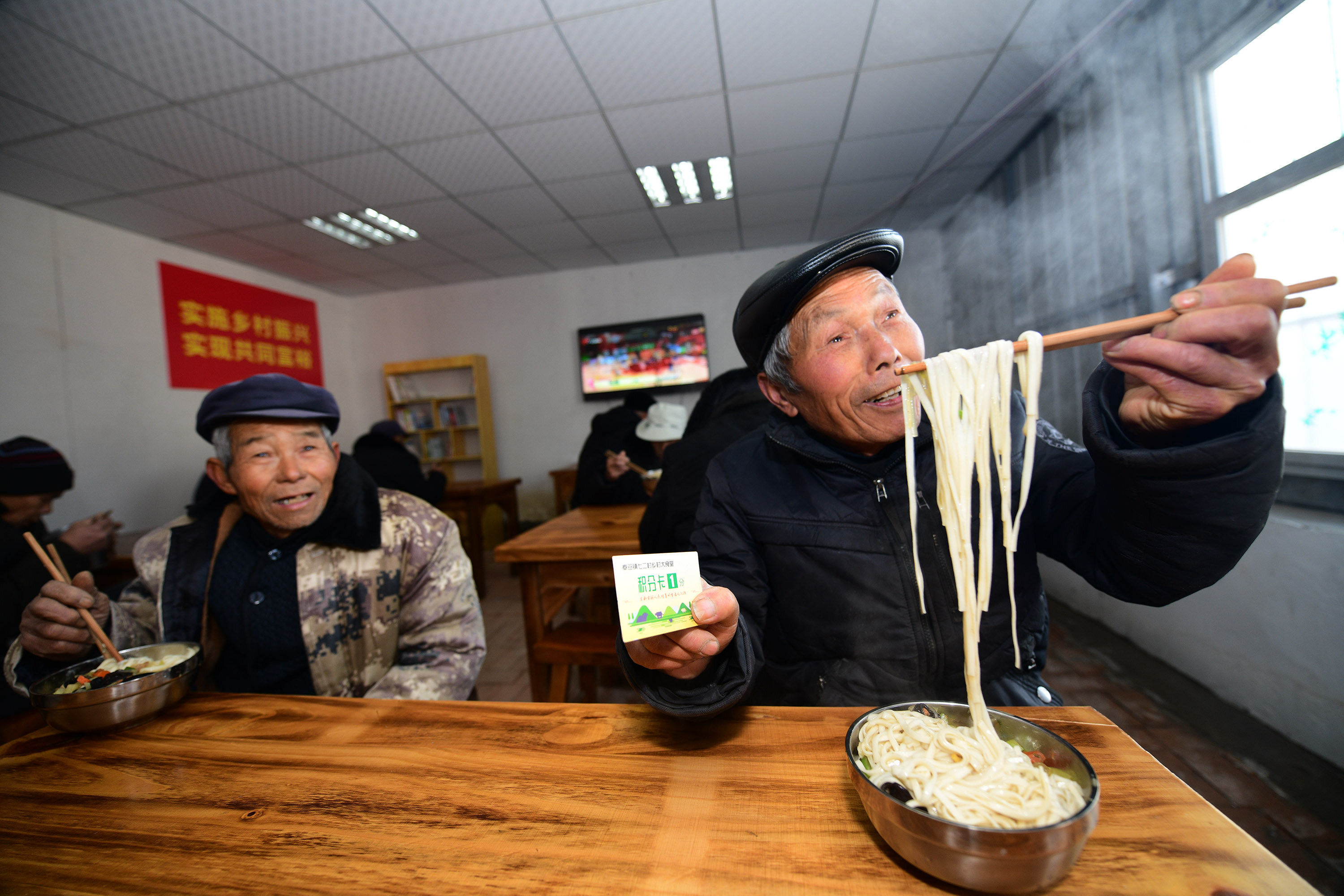 兩個月前,經過籌備,七里倉二村的村食堂建成,大鍋飯開伙。食堂設在一家去世的五保戶家里。村里將房子內外粉刷一遍,還買來了廚具、桌椅。做大鍋飯的是村里的兩名留守婦女。記者于12月15日中午趕來時,村食堂正開飯,老人們憑票打飯,午飯是臊子面。老人每人端一碗,來到飯廳就餐。這里有村里裝的電視,大家邊聊天邊吃飯邊看電視,其樂融融。