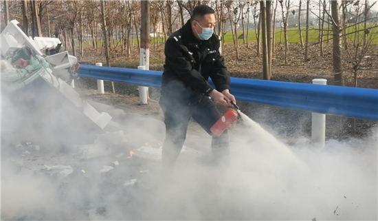 當日下午4點左右,太康縣交警大隊二中隊指導員南應開及輔警郭旗全、魯迪、尹晨豪正在趙堂村附近巡邏時,猛然看到前方一輛電動三輪車上有煙氣冒出,巡邏民警加速趕到。原來是一名老漢的一輛拉著廢舊紙箱的電動三輪車著了火,一車廢紙和塑料瓶散落一地正在燃燒,火越燒越旺,只見老漢正在手忙腳亂地滅火。這輛三輪車上拉的全是廢塑料、硬紙殼等易燃物,而且當時正刮著風,如果不及時滅火任由火勢蔓延,后果將不堪設想??吹酱饲闆r后,南應開迅速從警車上拿出滅火器秒變“消防員”,對著起火的物品進行滅火操作,同時安排輔警對過往行人和車輛進行疏導。由于發現和撲救及時,在民警的緊急救援下,火源很快被眾人合力撲滅。對太康交警面對火情臨危不亂、果斷處置、幫助群眾的行為,老漢車主和過往群眾紛紛點贊。②6